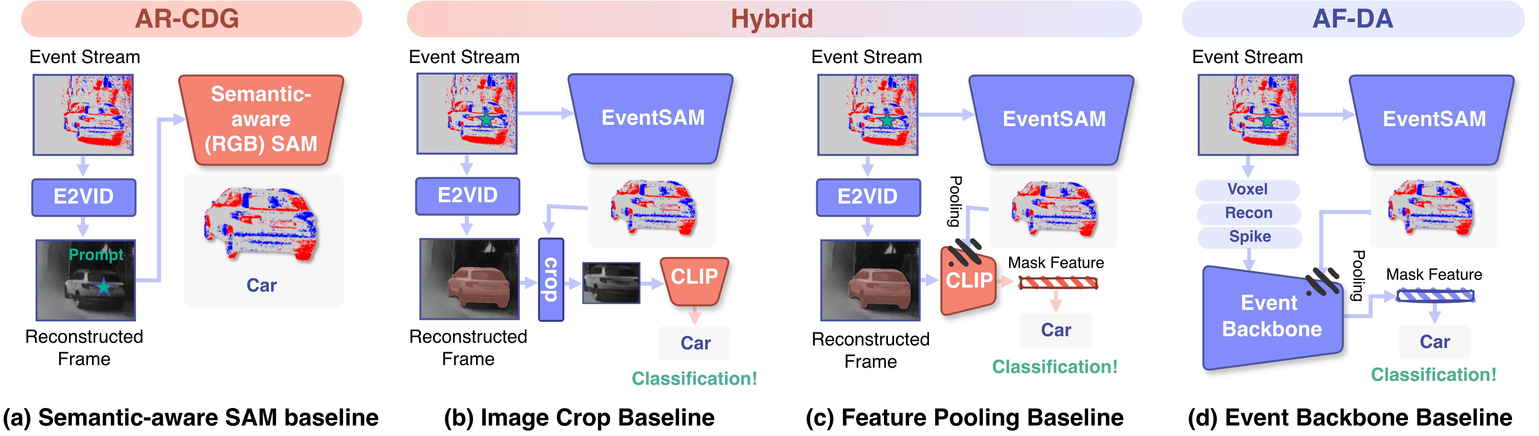 Four Types of Baseline under Three Categories. The three categories (AR-CDG, Hybrid, AF-DA) are designed as a baseline based on the strategy of transferring image-domain knowledge to the event domain. Refer to Sec. 3 and Supplementary material Sec. A.3 for further details. Those proposed baselines have two limitations: 1) AR-CDG and Hybrid categories still suffer from a huge domain gap between image and events despite the E2VID reconstruction. 2) All baselines require two distinct backbones for mask generation and classification which degrades parameter and inference efficiency.