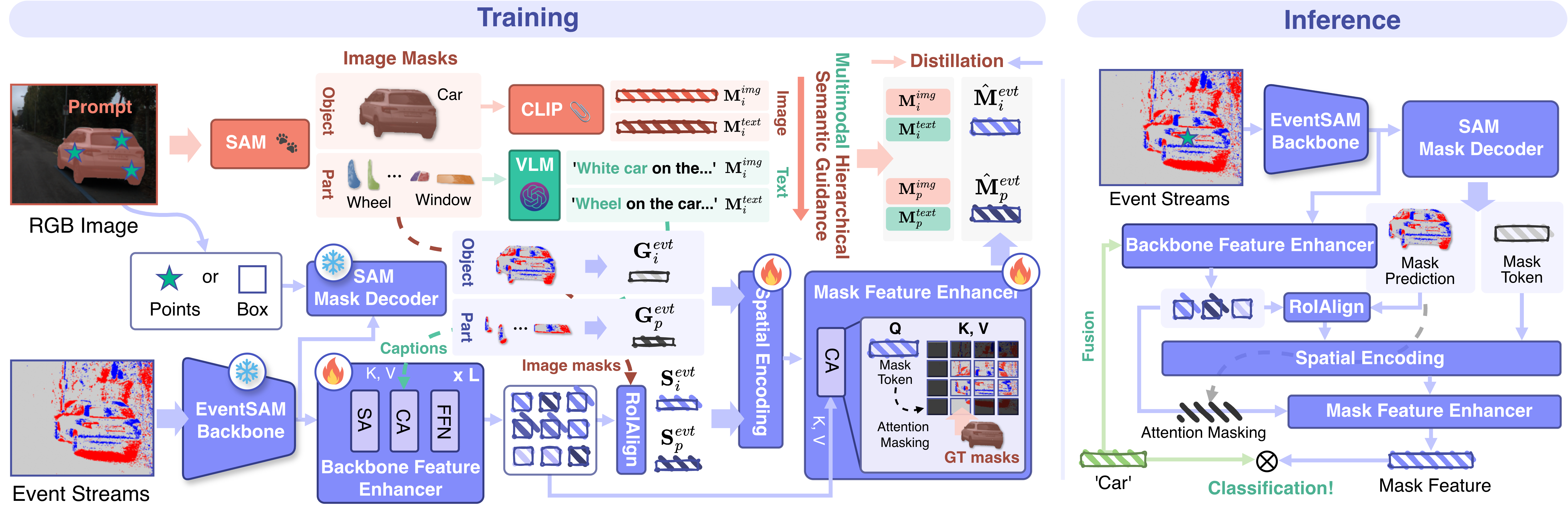 Overall framework of SEAL. The MHSG module (Red and Green) provides rich multimodal semantic guidance across multiple levels of granularity including part-level and instance-level. The multimodal fusion network of SEAL (Purple) enhances class prediction from a given binary mask by encoding rich semantic and spatial priors to produce a CLIP-aligned mask feature.